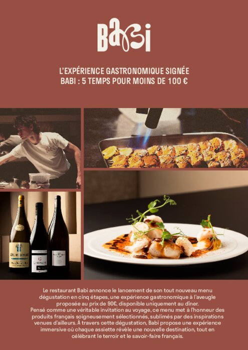 Le restaurant Babi annonce le lancement de son tout nouveau menu dégustation en cinq étapes, une expérience gastronomique à l’aveugle proposée au prix de 90€, disponible uniquement au dîner. Pensé comme une véritable invitation au voyage, ce menu met à l’honneur des produits français soigneusement sélectionnés, sublimés par des inspirations venues d’ailleurs. À travers cette dégustation, Babi propose une expérience immersive où chaque assiette révèle une nouvelle destination, tout en célébrant le terroir et le savoir-faire français.
