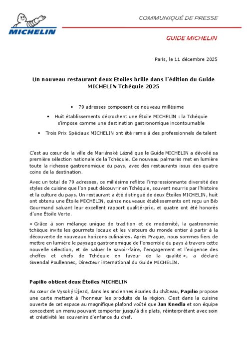 C’est au cœur de la ville de Mariánské Lázně que le Guide Michelin a dévoilé sa première sélection nationale de la Tchéquie. Ce nouveau palmarès met en lumière toute la richesse gastronomique du pays, avec des restaurants issus des quatre coins de la destination.