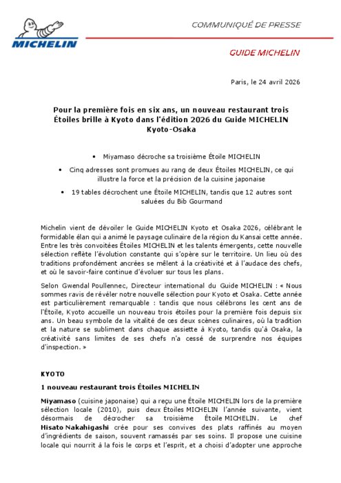 Michelin vient de dévoiler le Guide Michelin Kyoto et Osaka 2026, célébrant le formidable élan qui a animé le paysage culinaire de la région du Kansai cette année. Entre les très convoitées Étoiles Michelin et les talents émergents, cette nouvelle sélection reflète l’évolution constante qui s’opère sur le territoire. Un lieu où des traditions profondément ancrées se mêlent à la créativité et à l’audace des chefs, et où le savoir-faire continue d’évoluer sur tous les plans.