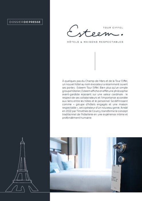 À quelques pas du Champ-de-Mars et de la Tour Eiffel, un nouvel hôtel au nom évocateur a récemment ouvert ses portes : Esteem Tour Eiffel. Bien plus qu’un simple groupe hôtelier, Esteem affiche en effet une philosophie avant-gardiste reposant sur une valeur cardinale : le respect de ses collaborateurs et l’importance accordée aux liens entre les hôtes et le personnel.