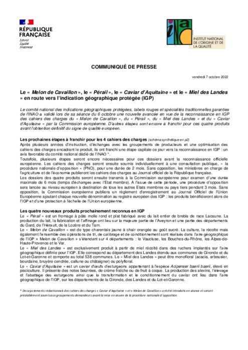 Le comité national des indications géographiques protégées, labels rouges et spécialités traditionnelles garanties de l'INAO a validé lors de sa séance du 6 octobre une nouvelle avancée en vue de la reconnaissance en IGP des cahiers des charges du « Melon de Cavaillon », du « Pérail », du « Miel des Landes » et du « Caviar d'Aquitaine » par la Commission européenne.