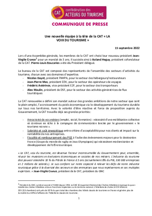 Une nouvelle équipe à la tête de la CAT « LA VOIX DU TOURISME »
