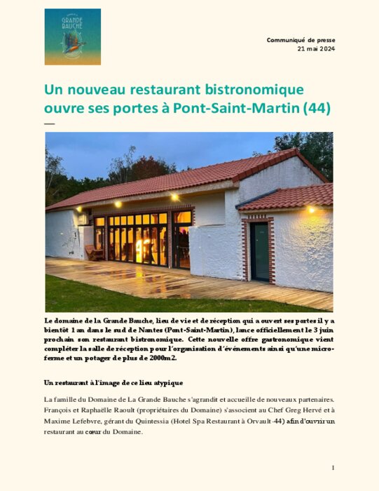 Le domaine de la Grande Bauche, lieu de vie et de réception qui a ouvert ses portes il y a bientôt 1 an dans le sud de Nantes (Pont-Saint-Martin), lance officiellement le 3 juin prochain son restaurant bistronomique. Cette nouvelle offre gastronomique vient compléter la salle de réception pour l’organisation d’événements ainsi qu’une micro-ferme et un potager de plus de 2000m².