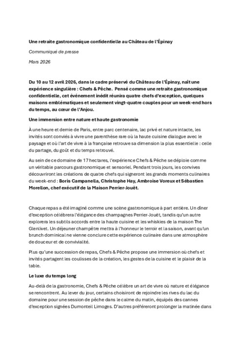 Du 10 au 12 avril, dans le cadre préservé du Château de l’Épinay, naît une expérience singulière : Chefs & Pêche. Pensé comme une retraite gastronomique confidentielle, cet événement inédit réunira quatre chefs d’exception, quelques maisons emblématiques et seulement vingt-quatre couples pour un week-end hors du temps, au cœur de l’Anjou.