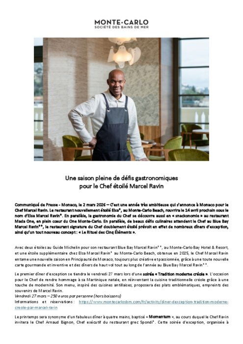 C’est une année très ambitieuse qui s’annonce à Monaco pour le chef Marcel Ravin. Le restaurant nouvellement étoilé Elsa, au Monte-Carlo Beach, rouvrira le 14 avril sous le nom d’Elsa Marcel Ravin. En parallèle, la gastronomie du Chef se découvre aussi en « snackonomie » au restaurant Mada One, en plein cœur du One Monte-Carlo. En parallèle, de beaux défis culinaires attendent le chef au Blue Bay Marcel Ravin, le restaurant signature du chef doublement étoilé prévoit en effet de nombreux dîners d’exception, ainsi qu’un tout nouveau concept : « Le Rituel des Cinq Éléments ».