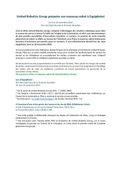 Créé en 2019, United Robotics Group s'emploie à développer des solutions robotiques pour aider le secteur du service à relever les défis de l’emploi et de la formation, et offrir aux consommateurs de plus grandes possibilités d'interactions humaines et sociales.