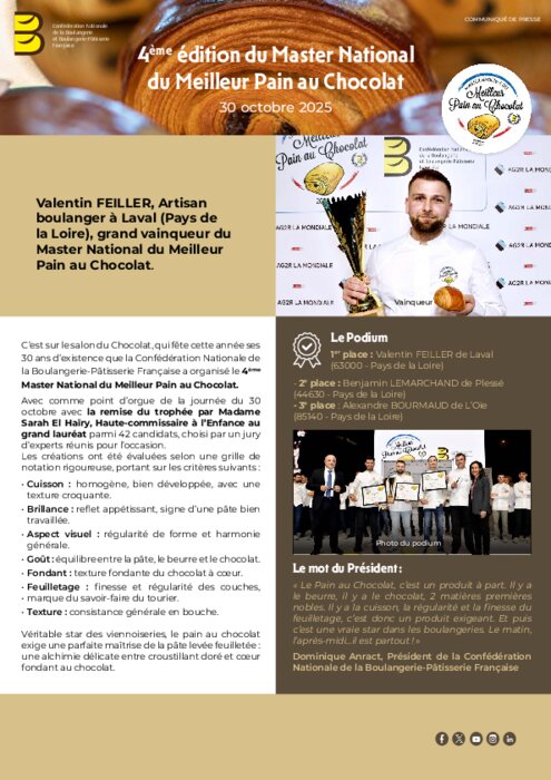 C’est sur le Salon du Chocolat, qui fête cette année ses 30 ans d’existence, que la Confédération Nationale de la Boulangerie-Pâtisserie Française a organisé le 4ᵉ Master National du Meilleur Pain au Chocolat.