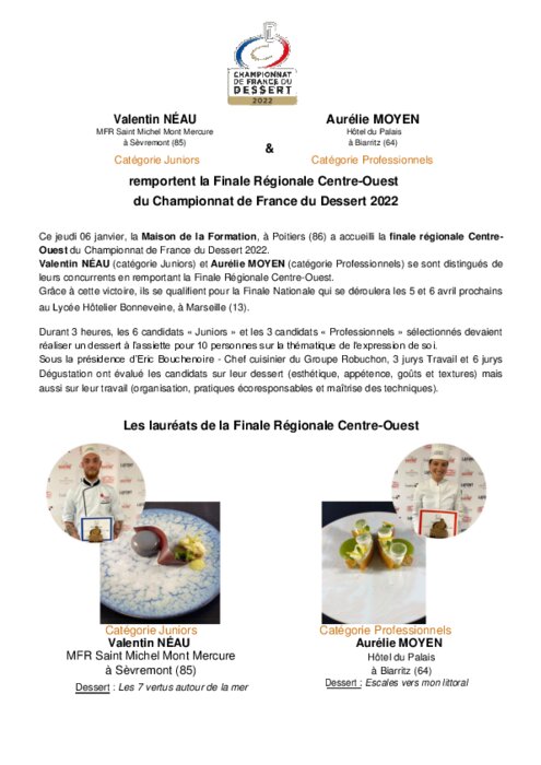 Métiers 06 janvier 2022 - 19:36 Durant 3 heures, les 6 candidats « Juniors » et les 3 candidats « Professionnels » sélectionnés devaient réaliser un dessert à l’assiette pour 10 personnes sur la thématique de l’expression de soi. PDF (321 Ko) Télécharger