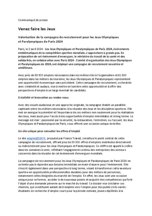 Les Jeux Olympiques et Paralympiques de Paris 2024, événements emblématiques de la compétition sportive mondiale, s'approchent à grands pas. En préparation de cet événement d'envergure, le ministère du travail de la santé et des solidarités, en collaboration avec Paris 2024 - Comité d'organisation des Jeux Olympiques et Paralympiques de 2024, ont déployé une campagne de recrutement novatrice et ambitieuse.