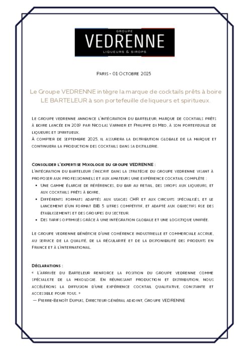 Le groupe vedrenne annonce l’intégration du barteleur, marque de cocktails prêts à boire lancée en 2019 par Nicolas Varnier et Philippe di Meo, à son portefeuille de liqueurs et spiritueux. À compter de septembre 2025, il assurera la distribution globale de la marque et continuera la production des cocktails dans sa distillerie.