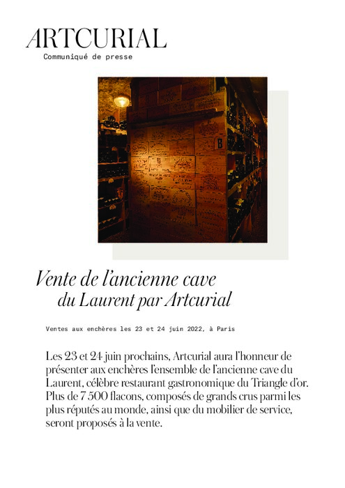 Les 23 et 24 juin prochains, Artcurial aura l’honneur de présenter aux enchères l’ensemble de l’ancienne cave du Laurent, célèbre restaurant gastronomique du Triangle d’or.