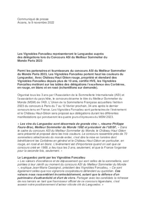 Fournisseurs 09 novembre 2022 - 18:23 Parmi les partenaires et fournisseurs du concours ASI du Meilleur Sommelier du Monde Paris 2023, Les Vignobles Foncalieu portent haut les couleurs du Languedoc. PDF (191 Ko) Télécharger