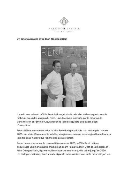 Restauration commerciale 14 octobre 2025 - 11:45 Il y a dix ans naissait la Villa René Lalique, écrin de cristal et de haute gastronomie niché au cœur des Vosges du Nord. Une décennie marquée par la création, la transmission et l’émotion, qui a façonné l’âme singulière de cette maison d’exception. PDF (93 Ko) Télécharger credit Villa René Lalique