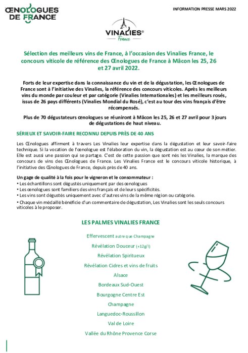 Le concours viticole de référence des Œnologues de France, les Vinalies France, se tiendra les 25, 26 et 27 avril 2022 à Mâcon.