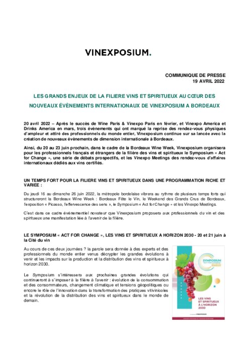 Après le succès de Wine Paris & Vinexpo Paris en février, et Vinexpo America et Drinks America en mars, trois évènements qui ont marqué la reprise des rendez-vous physiques d’ampleur et attiré des professionnels du monde entier, Vinexposium continue sur sa lancée avec la création de nouveaux évènements de dimension internationale à Bordeaux.