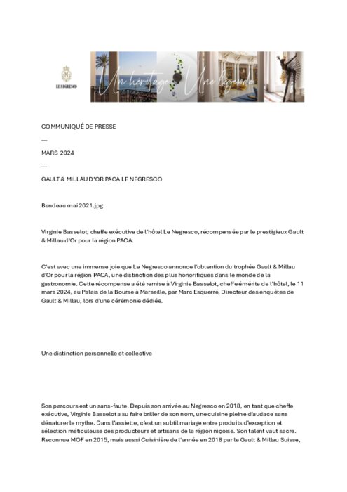 C’est avec une immense joie que Le Negresco annonce l'obtention du trophée Gault et Millau d'Or pour la région PACA, une distinction des plus honorifiques dans le monde de la gastronomie. Cette récompense a été remise à Virginie Basselot, cheffe émérite de l’hôtel, le 11 mars 2024, au Palais de la Bourse à Marseille, par Marc Esquerré, Directeur des enquêtes de Gault et Millau, lors d'une cérémonie dédiée.