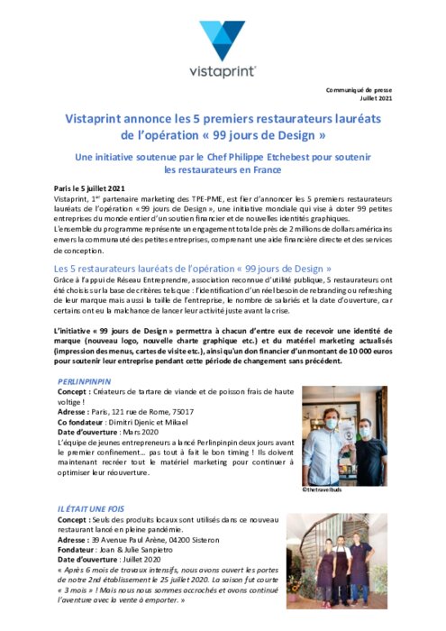 Vistaprint, 1er partenaire marketing des TPE-PME, est fier d'annoncer les 5 premiers restaurateurs lauréats de l'opération « 99 jours de Design », une initiative mondiale qui vise à doter 99 petites entreprises du monde entier d'un soutien financier et de nouvelles identités graphiques. L'ensemble du programme représente un engagement total de près de 2 millions de dollars américains envers la communauté des petites entreprises.