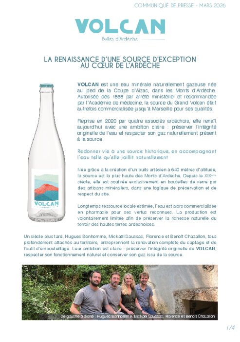Volcan est une eau minérale naturellement gazeuse née au pied de la Coupe d’Aizac, dans les Monts d’Ardèche. Autorisée dès 1868 par arrêté ministériel et recommandée par l’Académie de médecine, la source du Grand Volcan était autrefois commercialisée jusqu’à Marseille pour ses qualités.