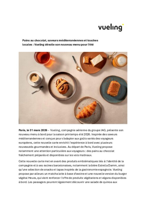 Vueling, compagnie aérienne du groupe IAG, présente son nouveau menu à bord pour la saison printemps-été 2026. Inspirée des saveurs méditerranéennes et conçue pour s’adapter aux goûts variés des voyageurs européens, cette nouvelle carte enrichit l’expérience à bord avec plusieurs nouveautés gourmandes et inclusives. Au départ de Paris, Vueling propose notamment une attention particulière aux voyageurs : des pains au chocolat fraîchement préparés et disponibles sur les vols matinaux.