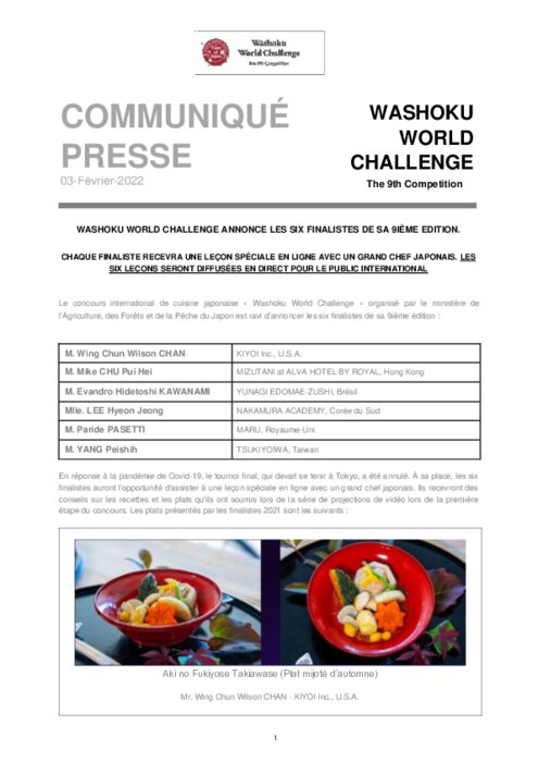 Métiers 03 février 2022 - 11:44 En réponse à la pandémie de Covid-19, le tournoi final, qui devait se tenir à Tokyo, a été annulé. À sa place, les six finalistes auront l'opportunité d'assister à une leçon spéciale en ligne avec un grand chef japonais PDF (579 Ko) Télécharger