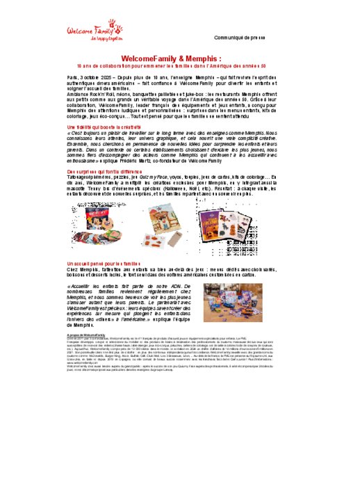 Depuis plus de 10 ans, l’enseigne Memphis – qui fait revivre l’esprit des authentiques diners américains – fait confiance à WelcomeFamily pour divertir les enfants et soigner l’accueil des familles. Ambiance Rock’n’Roll, néons, banquettes pailletées et juke-box : les restaurants Memphis offrent aux petits comme aux grands un véritable voyage dans l’Amérique des années 50. Grâce à leur collaboration, WelcomeFamily, leader français des équipements et jeux enfants, a conçu pour Memphis des attentions ludiques et personnalisées : surprises dans les menus enfants, kits de coloriage, jeux éco-conçus… Tout est pensé pour que les familles se sentent attendu