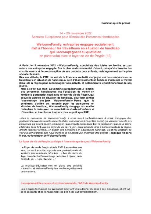 Fournisseurs 17 novembre 2022 - 09:50 WelcomeFamily, spécialiste des loisirs en famille, est par nature une entreprise engagée. PDF (184 Ko) Télécharger