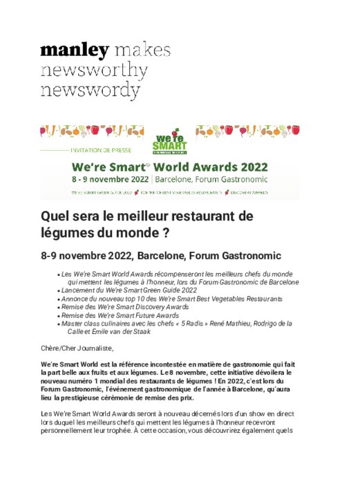 Métiers 16 juin 2022 - 11:01 We’re Smart World est la référence incontestée en matière de gastronomie qui fait la part belle aux fruits et aux légumes. PDF (264 Ko) Télécharger