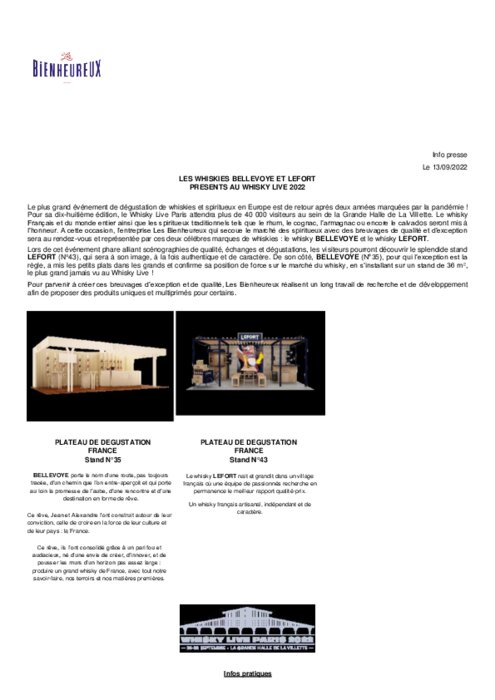 Fournisseurs 13 septembre 2022 - 09:00 Le plus grand événement de dégustation de whiskies et spiritueux en Europe est de retour après deux années marquées par la pandémie . PDF (192 Ko) Télécharger