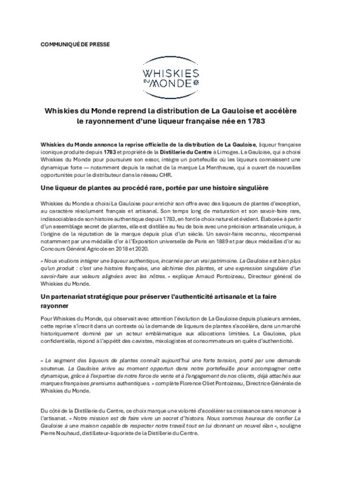 Whiskies du Monde annonce la reprise officielle de la distribution de La Gauloise, liqueur française iconique produite depuis 1783 et propriété de la Distillerie du Centre à Limoges. La Gauloise, qui a choisi Whiskies du Monde pour poursuivre son essor, intègre un portefeuille où les liqueurs connaissent une dynamique forte — notamment depuis le rachat de la marque La Mentheuse, qui a ouvert de nouvelles