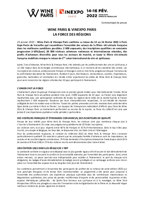 Métiers 25 janvier 2022 - 14:03 Wine Paris & Vinexpo Paris confirme sa tenue du 14 au 16 février 2022 à Paris Expo Porte de Versailles qui rassemblera l’ensemble des acteurs de la filière viti-vinicole française dans les meilleures conditions possibles. PDF (252 Ko) Télécharger