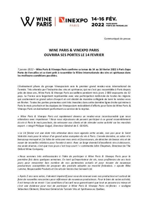 Métiers 07 janvier 2022 - 12:34 Wine Paris & Vinexpo Paris confirme sa tenue du 14 au 16 février à Paris Expo Porte de Versailles et se tient prêt à rassembler la filière internationale des vins et spiritueux dans les meilleures conditions possibles. PDF (254 Ko) Télécharger