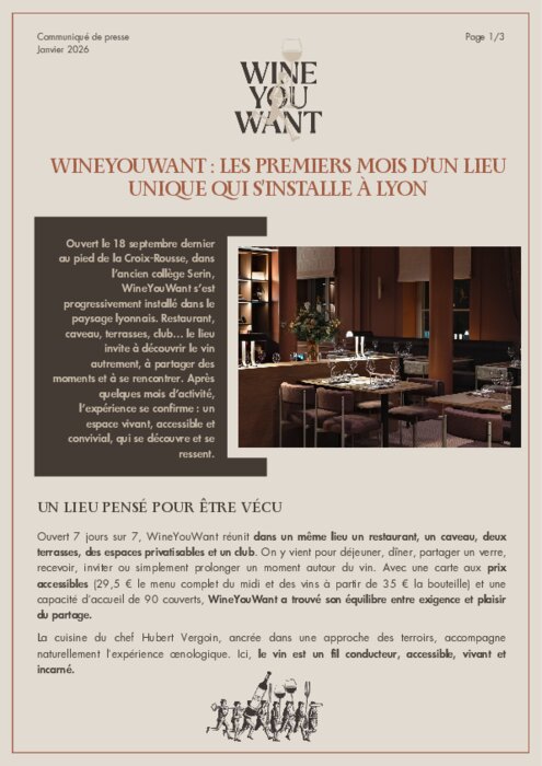 Ouvert en septembre dernier au pied de la Croix-Rousse, WineYouWant s’est rapidement imposé comme un nouveau lieu de référence à Lyon, entièrement pensé autour de l’expérience œnologique. Pensé comme un lieu vivant et accessible, ouvert 7 jours sur 7, WineYouWant mêle cuisine de terroirs signée Hubert Vergoin, une sélection de 600 références de vins dont 48 au verre, et une programmation régulière de rencontres avec les vignerons.