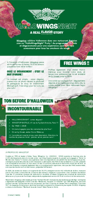 Fondée en 1994 et basée à Dallas, Texas, Wingstop Inc. exploite et franchise plus de 2 650 établissements dans le monde entier. Les Wing Experts (experts du poulet) sont engagés à "Servir le Monde avec Saveur" à travers une expérience client incomparable et une plateforme technologique de pointe. L’enseigne propose des ailes de poulet classiques ou désossées, des filets et des sandwichs au poulet, préparés à la commande et enrobés à la main dans l’un des 12 parfums audacieux et distinctifs choisis par les fans. Le menu de Wingstop comprend également des accompagnements signatures, tels que des frites assaisonnées, ainsi que des sauces ranch et bleu maison, préparées fraîchement.