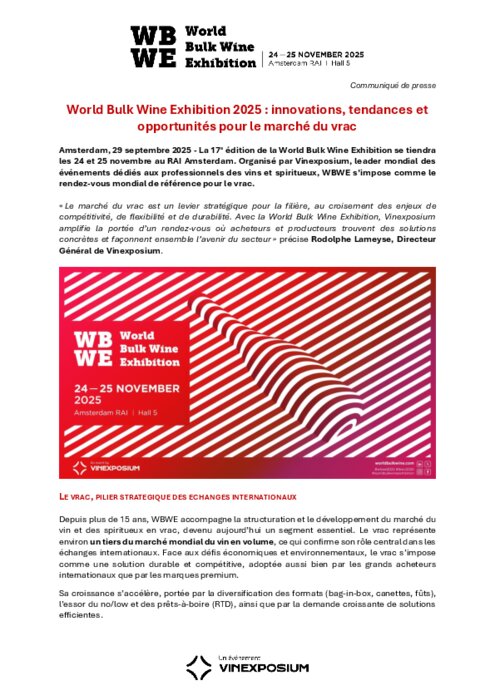 Métiers 29 septembre 2025 - 09:36 Organisé par Vinexposium, leader mondial des événements dédiés aux professionnels des vins et spiritueux, WBWE s’impose comme le rendez-vous mondial de référence pour le vrac. PDF (332 Ko) Télécharger