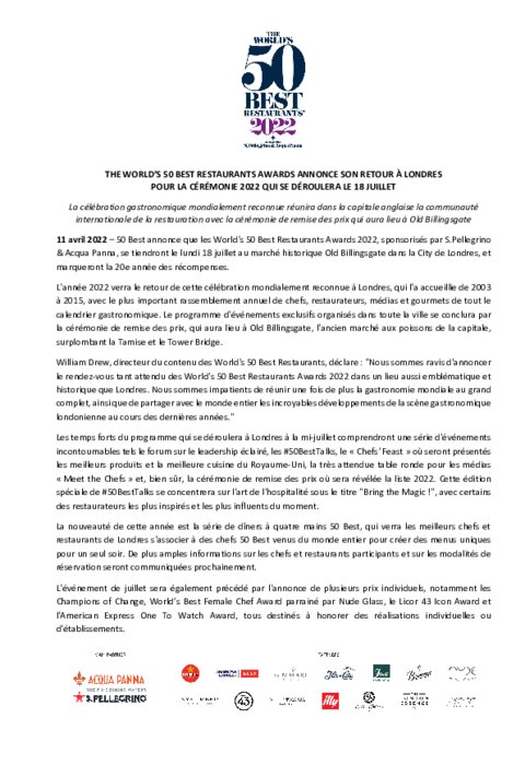 Métiers 11 avril 2022 - 12:13 La célébration gastronomique mondialement reconnue réunira dans la capitale anglaise la communauté internationale de la restauration avec la cérémonie de remise des prix qui aura lieu à Old Billingsgate. PDF (254 Ko) Télécharger