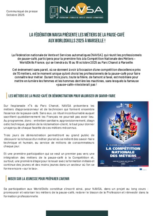 La Fédération nationale de Vente et Services automatiques (NAVSA), qui réunit les professionnels de pause-café, participera pour la première fois à la Compétition Nationale des Métiers – WorldSkills France, qui se tiendra du 16 au 18 octobre au Parc Chanot à Marseille. Cet événement sans pareil, où se donnent à voir à l’occasion d’une compétition d’excellence près de 70 métiers, est le moment unique qu’ont choisi les professionnels de la pause-café pour faire connaître leur métier.