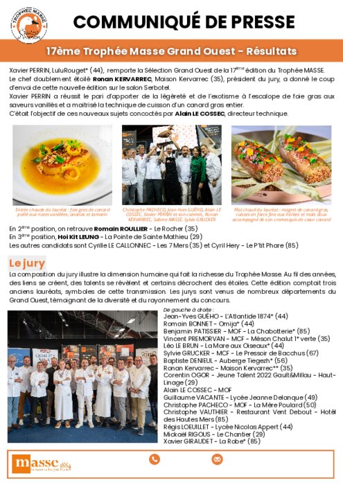 Le chef doublement étoilé Ronan Kervarrec, Maison Kervarrec (35), président du jury, a donné le coup d’envoi de cette nouvelle édition sur le salon Serbotel. Xavier Perrin a réussit le pari d’apporter de la légèreté et de l’exotisme à l’escalope de foie gras aux saveurs vanillés et a maitrisé la technique de cuisson d’un canard gras entier.