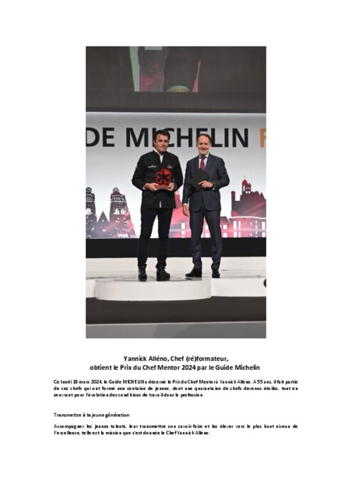 Ce lundi 18 mars, le Guide Michelina décerné le Prix du Chef Mentor à Yannick Alléno. A 55 ans, il fait partie de ces chefs qui ont formé une centaine de jeunes, dont une quarantaine de chefs devenus étoilés, tout en œuvrant pour l’évolution des conditions de travail dans la profession. Transmettre à la jeune génération, Accompagner les jeunes talents, leur transmettre son savoir-faire et les élever vers le plus haut niveau de l’excellence, telle est la mission que s’est donnée le Chef Yannick Alléno.