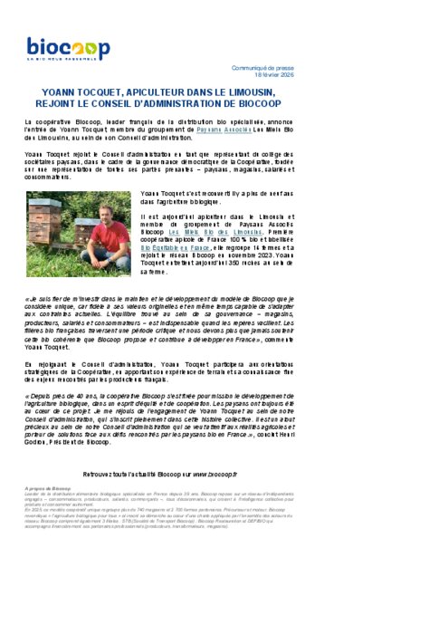 La coopérative Biocoop, leader français de la distribution bio spécialisée, annonce l’entrée de Yoann Tocquet, membre du groupement de Paysans Associés Les Miels Bio des Limousins, au sein de son Conseil d’administration.