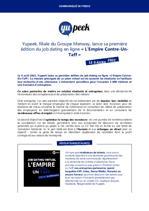 « L’Empire Contre-Un-Taff » a également pour objectif d'optimiser le temps des recruteurs : en une journée, de nombreux talents se succéderont sur les stands, permettant ainsi aux entreprises de découvrir de nombreux potentiels qui auraient pu passer à l'as, cachés sous un CV mal mis en forme ou une lettre de motivation hésitante.