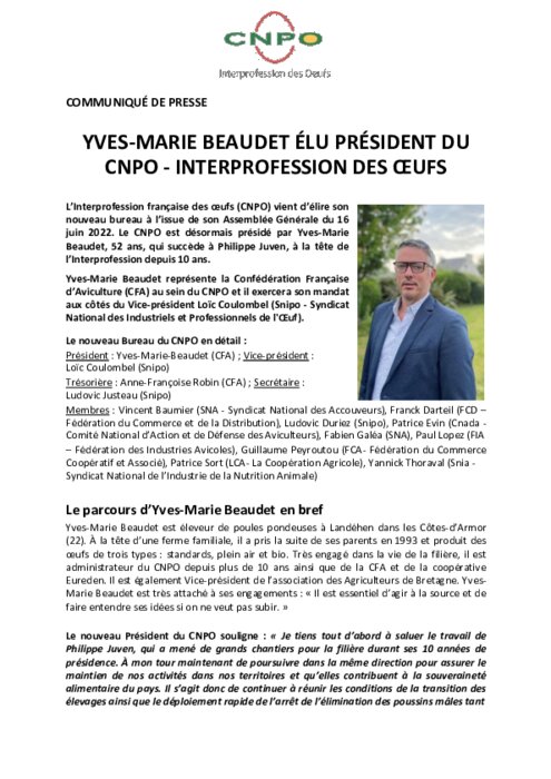 Métiers 22 juin 2022 - 15:03 Le CNPO est désormais présidé par Yves-Marie Beaudet, 52 ans, qui succède à Philippe Juven, à la tête de l’Interprofession depuis 10 ans. PDF (229 Ko) Télécharger