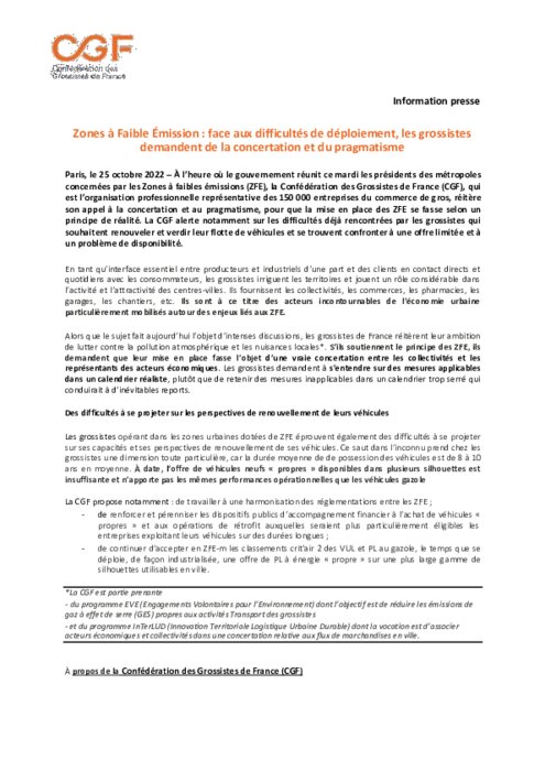 La Confédération des Grossistes de France (CGF), qui est l’organisation professionnelle représentative des 150 000 entreprises du commerce de gros, réitère son appel à la concertation et au pragmatisme, pour que la mise en place des ZFE se fasse selon un principe de réalité.