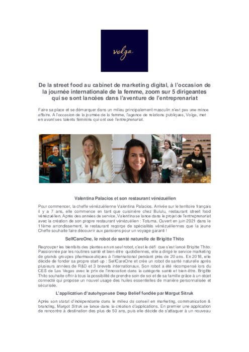 Métiers 24 février 2022 - 08:57 De la street food au cabinet de marketing digital, à l’occasion de la journée internationale de la femme, zoom sur 5 dirigeantes qui se sont lancées dans l’aventure de l’entrepreneuriat. PDF (192 Ko) Télécharger