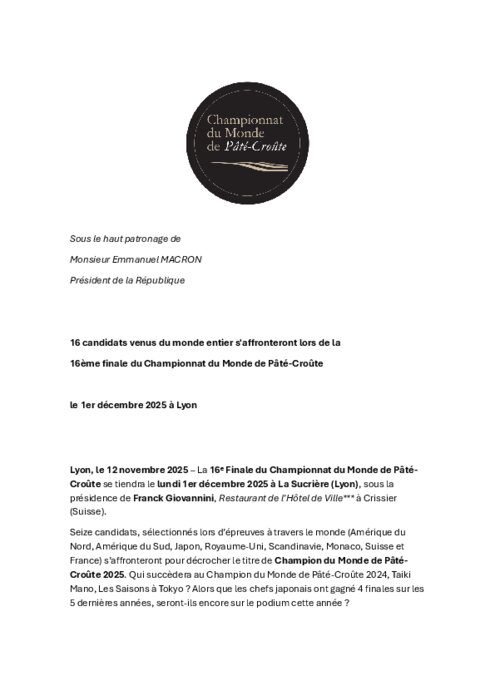 Seize candidats, sélectionnés lors d’épreuves à travers le monde (Amérique du Nord, Amérique du Sud, Japon, Royaume-Uni, Scandinavie, Monaco, Suisse et France) s’affronteront pour décrocher le titre de Champion du Monde de Pâté-Croûte 2025. Qui succèdera au Champion du Monde de Pâté-Croûte 2024, Taiki Mano, Les Saisons à Tokyo ? Alors que les chefs japonais ont gagné 4 finales sur les 5 dernières années, seront-ils encore sur le podium cette année ?