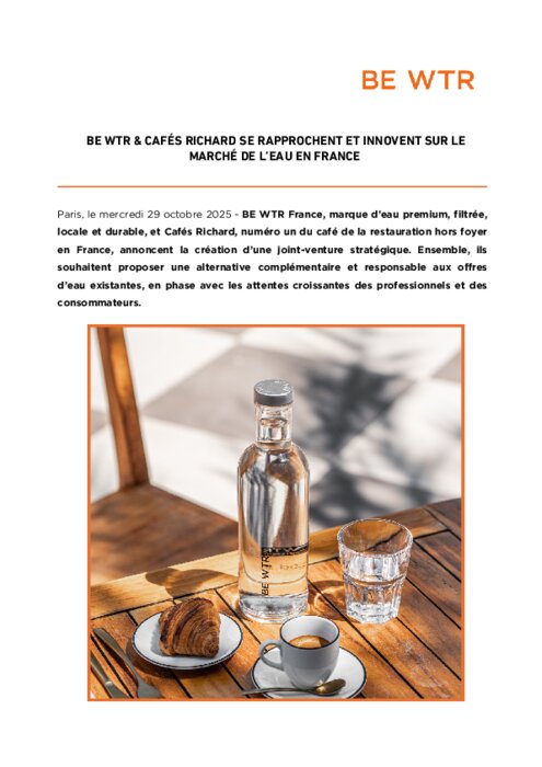 BE WTR France, marque d’eau premium, filtrée, locale et durable, et Cafés Richard, numéro un du café de la restauration hors foyer en France, annoncent la création d’une joint-venture stratégique. Ensemble, ils souhaitent proposer une alternative complémentaire et responsable aux offres d’eau existantes, en phase avec les attentes croissantes des professionnels et des consommateurs.