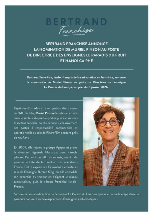 Bertrand Franchise annonce la nomination de Muriel Pinson au poste de Directrice des enseignes Le Paradis du Fruit et Hanoï Cà Phê