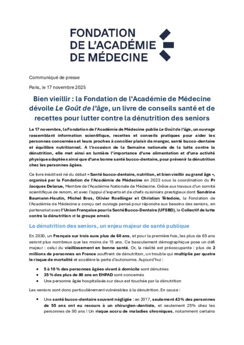 La Fondation de l’Académie de Médecine publie Le Goût de l’âge, un ouvrage rassemblant information scientifique, recettes et conseils pratiques pour aider les personnes concernées et leurs proches à concilier plaisir de manger, santé bucco-dentaire et équilibre nutritionnel. A l’occasion de la Semaine nationale de la lutte contre la dénutrition, elle met ainsi en lumière l’importance d’une alimentation et d’une activité physique adaptées ainsi que d’une bonne santé bucco-dentaire, pour prévenir la dénutrition chez les personnes âgées.