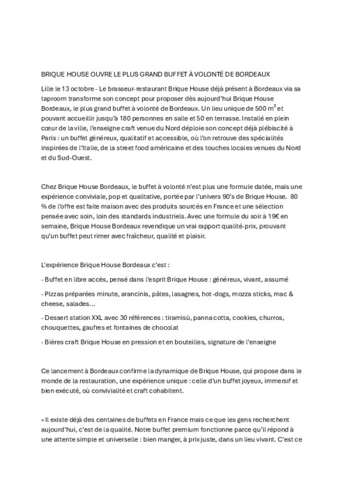 Le brasseur-restaurant Brique House déjà présent à Bordeaux via sa taproom transforme son concept pour proposer dès aujourd’hui Brique House Bordeaux, le plus grand buffet à volonté de Bordeaux. Un lieu unique de 500 m² et pouvant accueillir jusqu’à 180 personnes en salle et 50 en terrasse. Installé en plein cœur de la ville, l’enseigne craft venue du Nord déploie son concept déjà plébiscité à Paris : un buffet généreux, qualitatif et accessible, où l’on retrouve des spécialités inspirées de l’Italie, de la street food américaine et des touches locales venues du Nord et du Sud-Ouest.