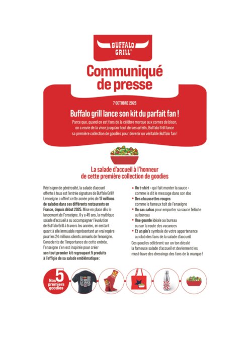 Réel signe de générosité, la salade d'accueil offerte à tous est l'entrée signature de Buffalo Grill! L'enseigne a offert cette année près de 17 millions de salades dans ses différents restaurants en France, depuis début 2025. Mise en place des le lancement de l'enseigne, il y a 45 ans, la mythique salade d'accueil a su accompagner l'évolution de Buffalo Grill à travers les années, en restant quant à elle immuable représentant un vrai repère pour les 24 millions de clients annuels de l'enseigne. Consciente de l'importance de cette entrée, l'enseigne s'en est inspirée pour créer son tout premier kit regroupant 5 produits à l'effigie de sa salade emblématique.