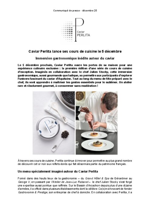 Le 5 décembre, Caviar Perlita ouvre les portes de sa maison pour une expérience culinaire exclusive : la première édition d’une série de cours de cuisine d’exception. Imaginés en collaboration avec le chef Julien Stocky, cette immersion gastronomique, aussi gourmande que ludique, va permettre aux participants d’explorer l’univers fascinant du caviar d’Aquitaine. Tout au long du menu de fête préparé avec le chef, ils vont apprendre à maîtriser les gestes essentiels pour le sublimer. Un atelier rare et résolument gourmet, à consommer sans modération.